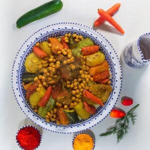 Un grand classique de la cuisine marocaine, préparé dans le respect de la tradition. Une semoule fine et légère, accompagnée de légumes mijotés et d’un poulet tendre et savoureux, longuement cuisiné dans un bouillon parfumé aux épices. Un plat complet, généreux et convivial, parfait pour les repas en famille ou les grandes tablées.